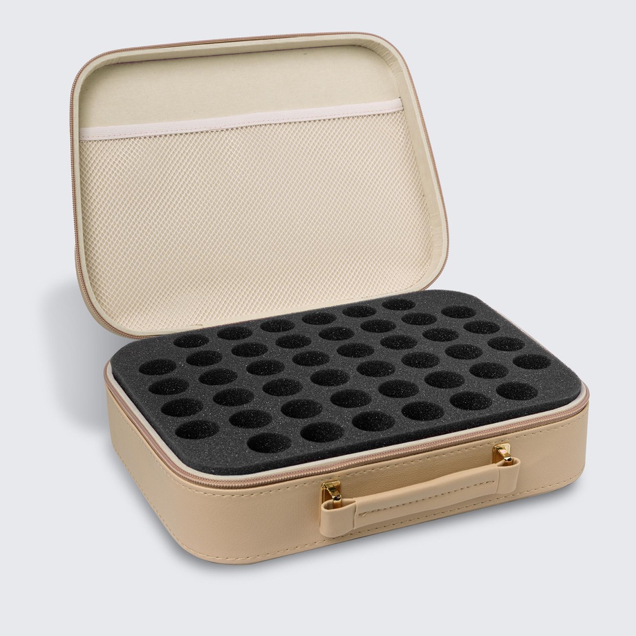 The gelmoment storage case is a sturdy organizer bag with a waterproof PU leather exterior. It comes with a thick foam insert that holds polish bottles securely in an upright position. This insert is also removable, making the bag a multipurpose storage case that comes in handy both at home and on the go.